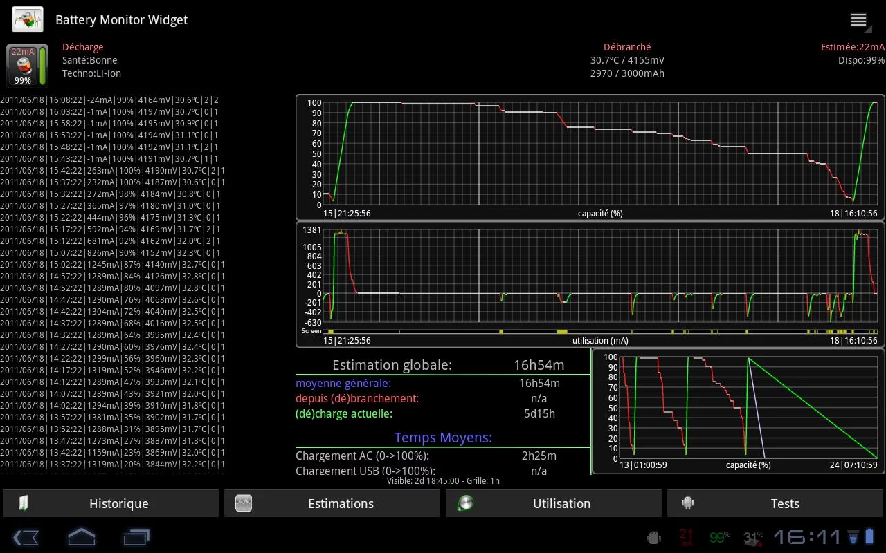 complete tool : Shows historical data (%, mA, mW, mV ), calculates estimated run-times aging, helps calibrate battery run-time.