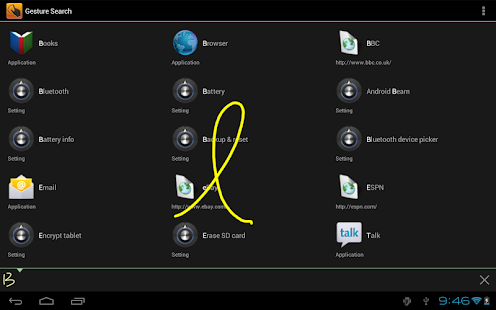 overview: Gesture Search lets access contacts, applications, settings, music Android device letters. refines search results add, better learns from history.